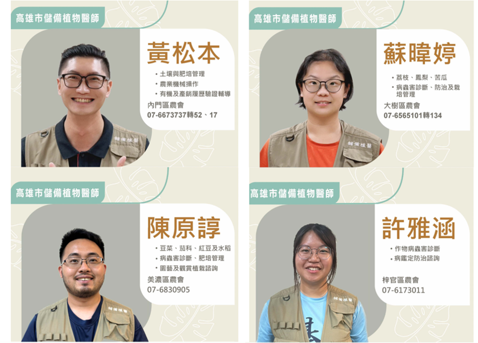 106年農業局配合食安五環政策聘用儲備植物醫師,並派駐產區農會以即時服務本市農友。農業局為強化儲備植物醫師輔導效率及量能,於「高雄植醫來幫忙」系統納入植醫掛號及諮詢服務,以提供高雄市民便捷的作物病蟲害診斷及安全用藥諮詢管道,以維護高雄市安全農業生產環境。